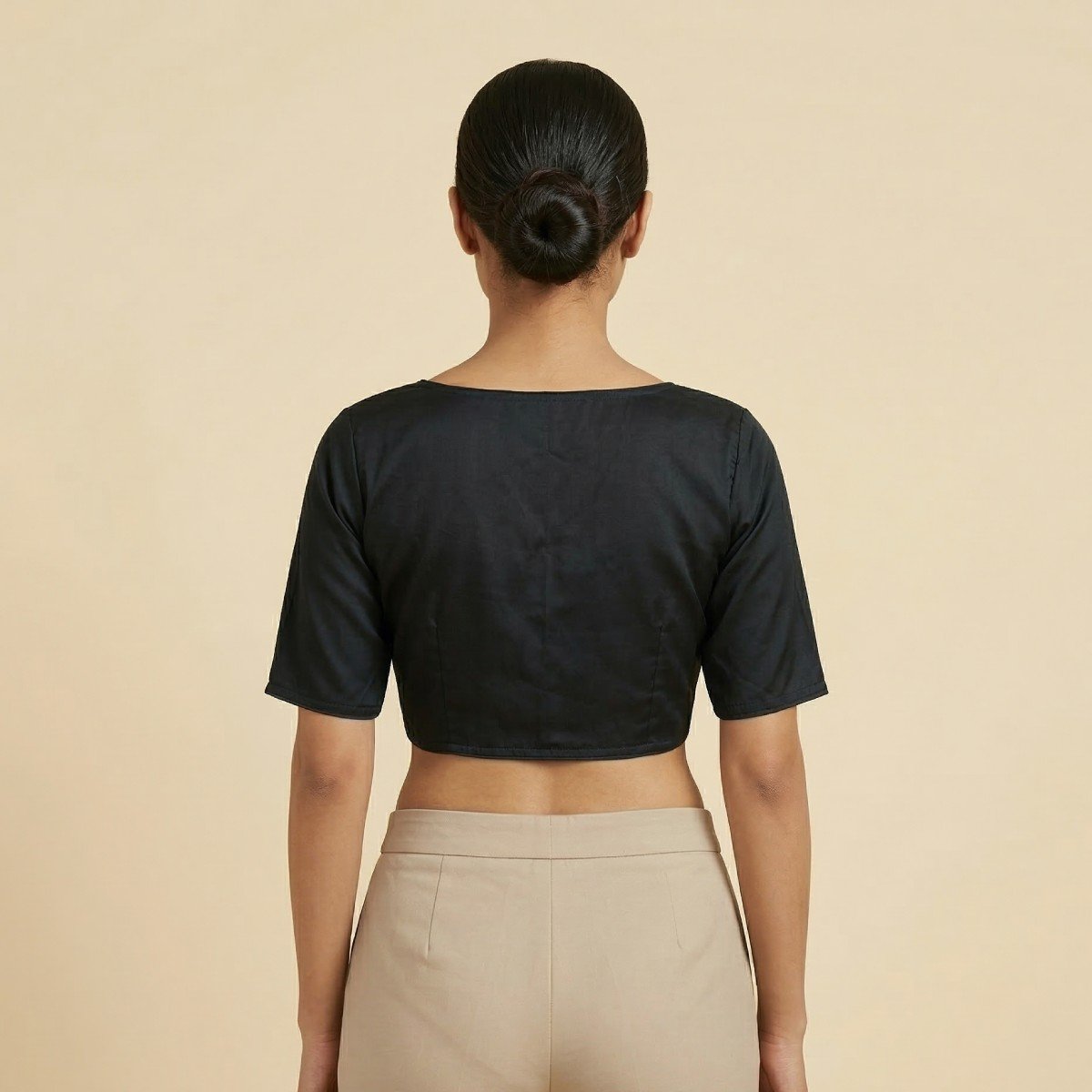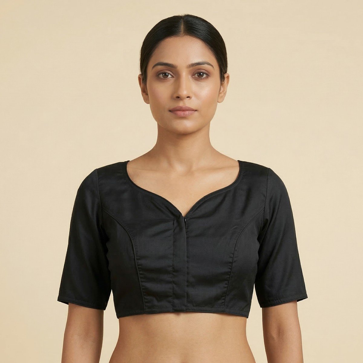 This beautiful non-padded blouse looks stunning with its smooth satin cotton fabric, providing the perfect blend of comfort and luster. This blouse boasts a graceful paan gala neckline, perfectly accentuating the neck area with a minimalist look. The plain style of this blouse makes it easy to pair with different types of sarees for casual as well as party wear. The tailored fit with half sleeves gives this blouse a perfect silhouette.