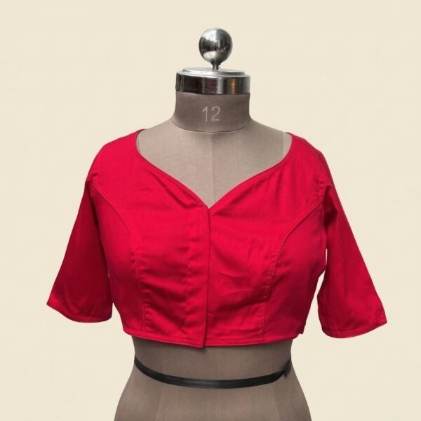 Non-padded satin cotton blouse with a stylish paan gala neckline and a clean, plain design—perfect for an elegant everyday or occasion look.Ready size for the blouse is bust 38 and waist 34, extendable up to bust 40 and waist 38.