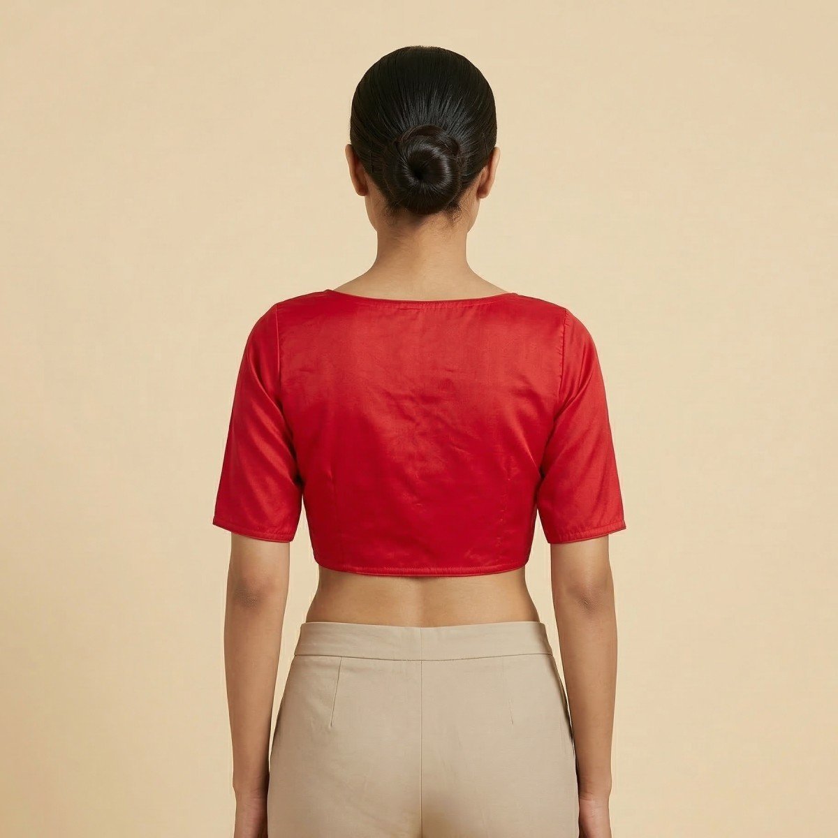 This beautiful non-padded blouse looks stunning with its smooth satin cotton fabric, providing the perfect blend of comfort and luster. This blouse boasts a graceful paan gala neckline, perfectly accentuating the neck area with a minimalist look. The plain style of this blouse makes it easy to pair with different types of sarees for casual as well as party wear. The tailored fit with half sleeves gives this blouse a perfect silhouette.