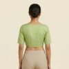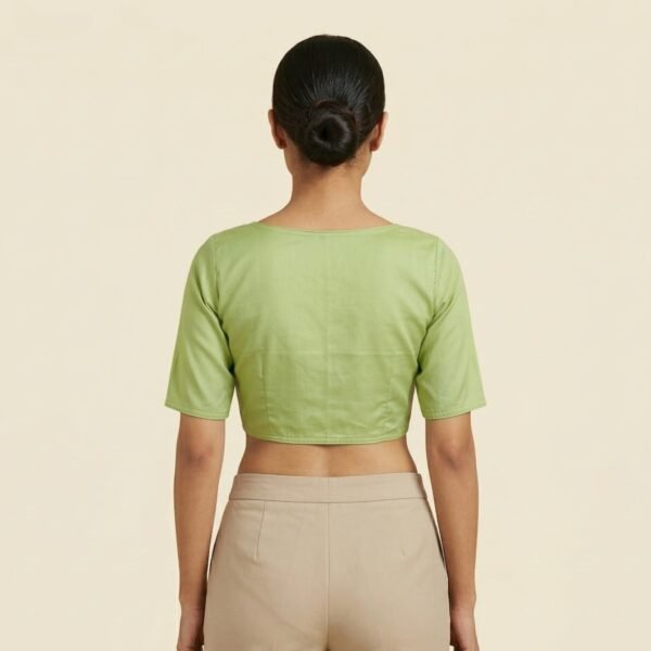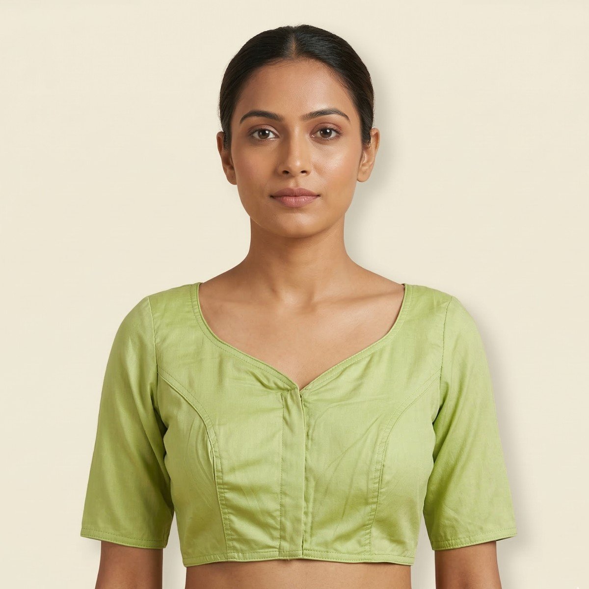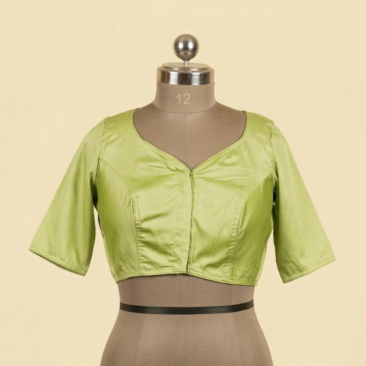 Non-padded satin cotton blouse with a stylish paan gala neckline and a clean, plain design—perfect for an elegant everyday or occasion look.Ready size for the blouse is bust 38 and waist 34, extendable up to bust 40 and waist 38.