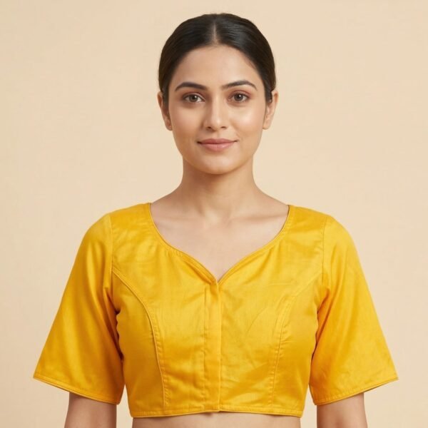 This beautiful non-padded blouse looks stunning with its smooth satin cotton fabric, providing the perfect blend of comfort and luster. This blouse boasts a graceful paan gala neckline, perfectly accentuating the neck area with a minimalist look. The plain style of this blouse makes it easy to pair with different types of sarees for casual as well as party wear. The tailored fit with half sleeves gives this blouse a perfect silhouette.